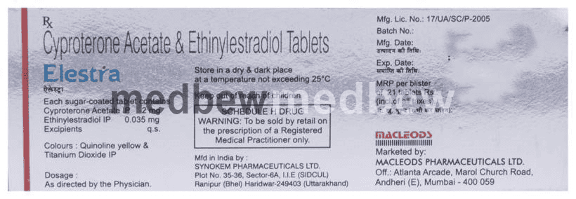 Elestra Tablet is a combination of two hormonal medicines: Cyproterone and Ethinyl Estradiol which treats PCOS symptoms such as acne, excessive hair growth (hirsutism) and irregular periods. Cyproterone works by blocking the overproduction of androgens (male hormones) in the ovaries, thereby reducing unwanted hair growth and acne. Ethinyl Estradiol enhances the effect of Cyproterone by reducing the amount of androgens in the blood. Together, they also regularize the menstrual cycle in PCOS.