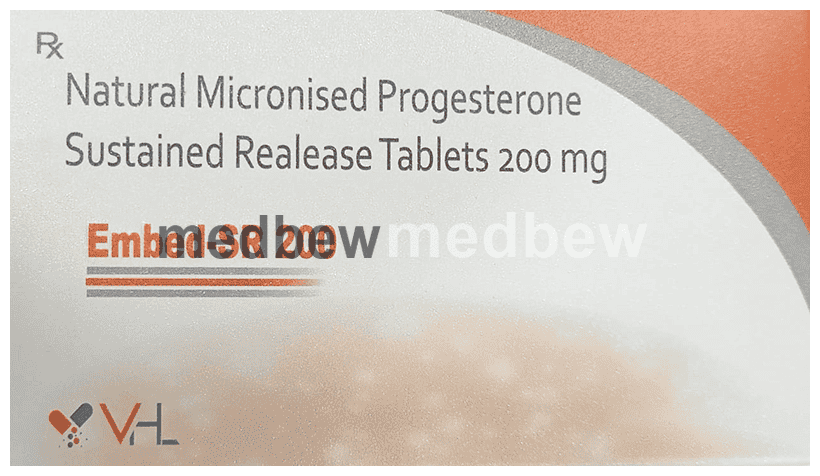Embed-SR 200 Tablet is a progesterone (female hormone). It helps to establish and maintain pregnancy. It also prevents the increase in thickness of the endometrium (lining of the uterus) caused by estrogen.