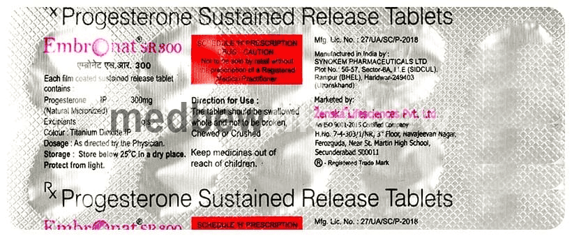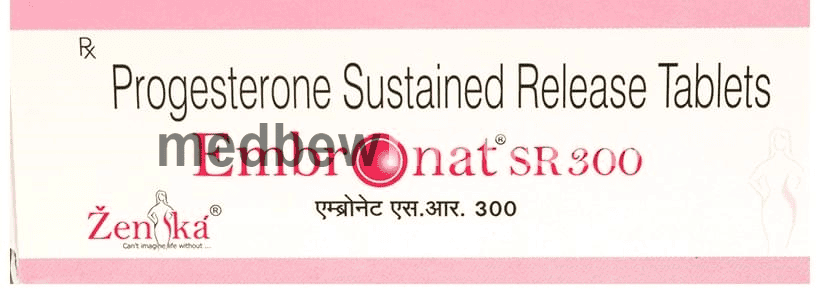 Embronat SR 300 Tablet is a type of progesterone hormone which is extracted from plants, but its property matches with the human progesterone. This medicine undergoes a process called micronization where the size of the natural progesterone is reduced. The small size of the progesterone particles enhances its dissolution and absorption. This provides better availability of Embronat SR 300 Tablet in the body and decreases its side effects.