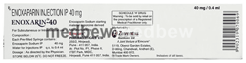 Enoxarin 40 Injection is an anticoagulant used to prevent and treat harmful blood clots. It stops the existing clots from getting any bigger and restricts the formation of any new clot. It is also helpful in the prevention of blood clots in veins, a condition called deep vein thrombosis, and pulmonary embolism.