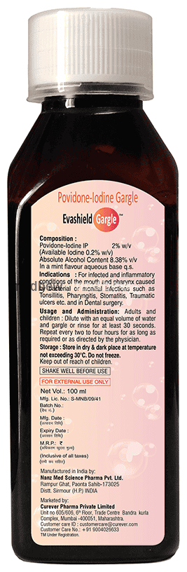 Evashield Gargle is a versatile antiseptic that is used for the treatment and prevention of infection. Evashield Gargle kills and prevents the growth of infection-causing microbes, thereby preventing abrasions, cuts, and wounds, or any break in the skin from getting infected. The antiseptic effect is caused due to the slow release of iodine. Keep the affected area clean and use the medicine as prescribed by your doctor.show moreshow less