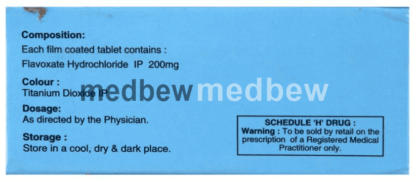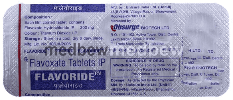 Flavoride Tablet is used to treat and prevent muscle spasms of the urinary tract (the urine passing tube). It relaxes the muscles of the urinary tract to relieve symptoms like painful urination, excessive urination at night, and the inability to control urine flow.