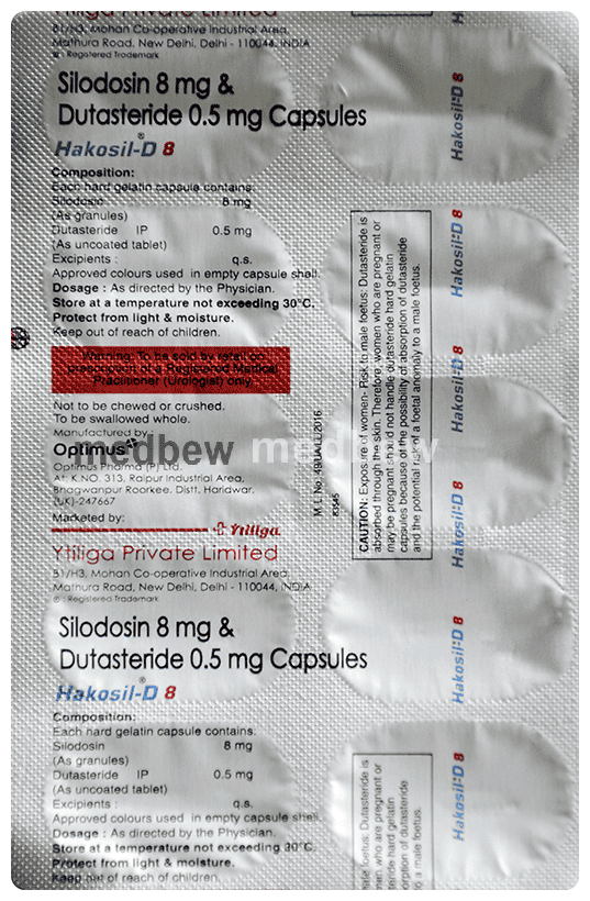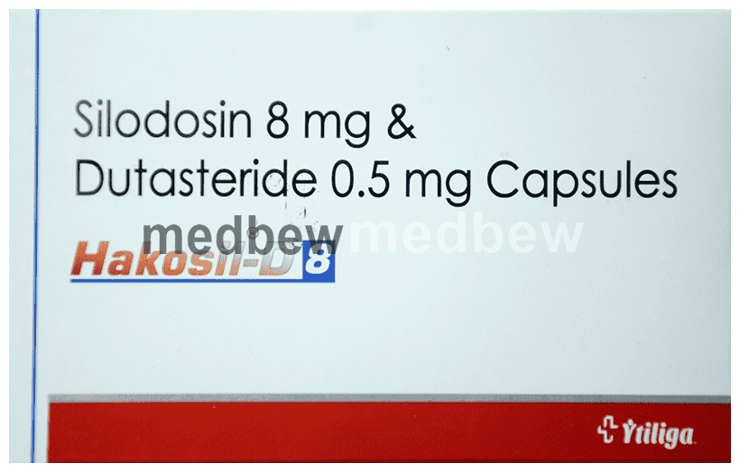 Hakosil-D 8 Capsule is a combination of two medicines that work in different ways to treat men with an enlarged prostate gland. It helps to relieve symptoms such as difficulty urinating or needing to go to the toilet more often. It is not used to prevent prostate cancer.