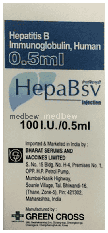 Hepabsv 100IU Injection helps to protect you against hepatitis B (a virus that damages the liver). It is used to prevent hepatitis B after exposure to contaminated blood through sexual contact, accidental needle prick injury, from an infected mother to her newborn or after a liver transplant.