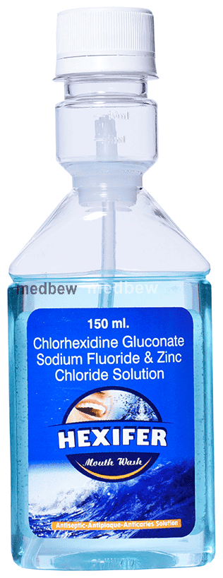 Hexifer Mouth Wash Buy 1 Get 1 Free is a combination of three medicines: Chlorhexidine Gluconate, Sodium Fluoride and Zinc Chloride. Chlorhexidine Gluconate is an antiseptic. It works by binding to the surface of teeth, inner cheeks and gums. This kills the infectious microorganisms that cause gum disease, ulcers and other mouth infections. Sodium Fluoride works by making the teeth stronger and preventing decay (cavity) caused by bacteria. Zinc Chloride has antiseptic and astringent action.