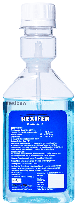 Hexifer Mouth Wash Buy 1 Get 1 Free is a combination of three medicines. It is used to treat infection of mouth or gums. This mouthwash has antimicrobial action on the infection-causing bacteria. It also prevents the teeth from getting cavities and makes them stronger.