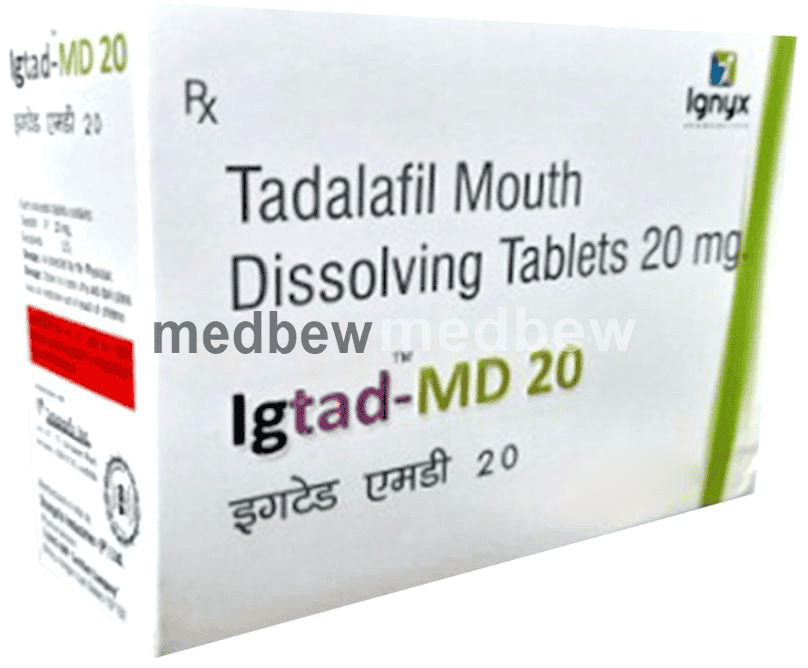 Igtad-MD 20 Tablet is a phosphodiesterase (PDE-5) inhibitor. It works in erectile dysfunction by increasing blood flow to the penis by relaxing the muscles in penile blood vessels.
