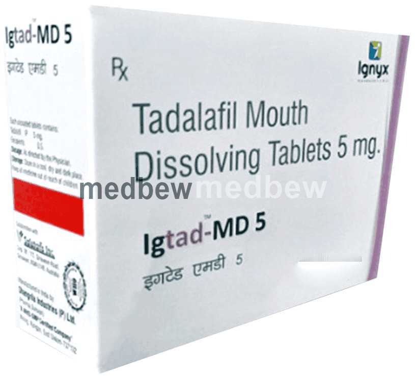Igtad-MD 5 Tablet may be taken on an empty stomach or with a meal. It should be strictly taken as advised by your doctor. The medicine will only help you to get an erection if you are sexually stimulated. You should take it about one hour before you plan to have sex. The amount of time it takes to work varies from person to person, but it normally takes between 30 minutes and one hour. Only take it if you need it and it has been prescribed to you by a doctor.The most common side effects of this medicine are flushing, headache, blurred vision, muscle pain, stomach upset, and rash. Talk to your doctor if the side effects bother you or will not go away.This medicine is not intended for use by women and men should avoid using any other medicines to treat impotence without talking to a doctor. It can be dangerous to take it along with medicines called nitrates (often given for chest pain). Do not take this medicine if you have severe heart or liver problems, if you have recently had a stroke or heart attack or if you have low blood pressure. Let your doctor know if you suffer from these or any other health problems before taking it. You should not drive if this medicine makes you feel dizzy. Avoid drinking alcohol while taking this medicine as it can lead to side effects.