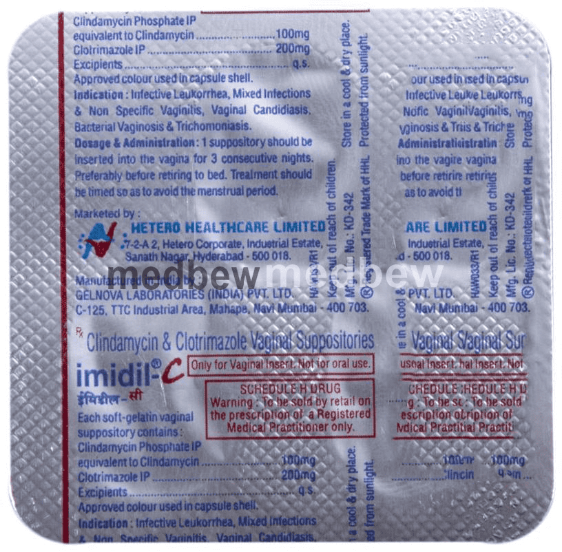 Imidil-C Vaginal Suppository is a combination medicine that is prescribed to treat various types of vaginal infections associated with vaginal discharge. It fights against the infection by stopping the growth of infection-causing microorganisms. It also prevents further spread of the infection.