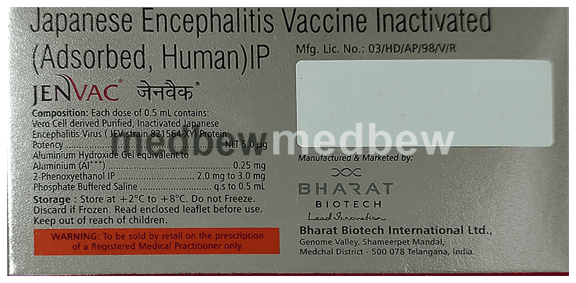 Jenvac Vaccine is a medicine used for prevention of Japanese encephalitis (JE). It protects against JE and is given as part of universal immunization program for selected places endemic to JE.