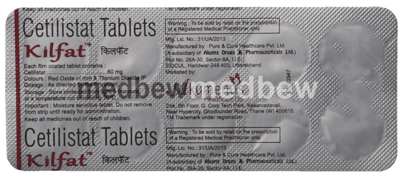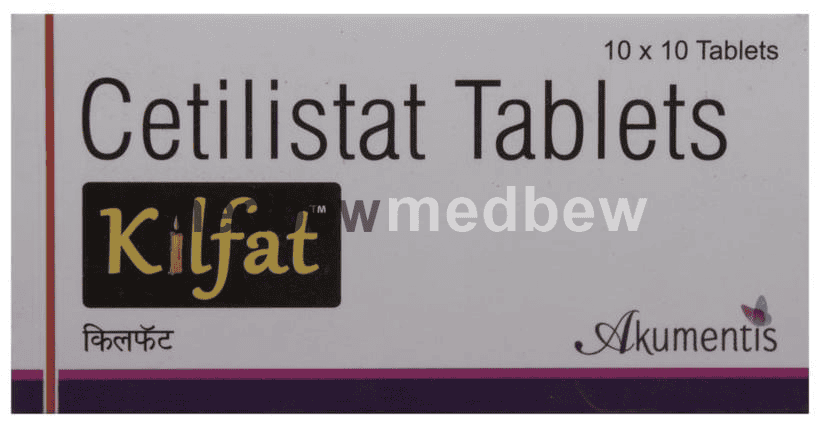 Kilfat Tablet is a medicine used in the treatment of obesity. It helps the body in blocking the absorption of fats from the small intestines and stomach.