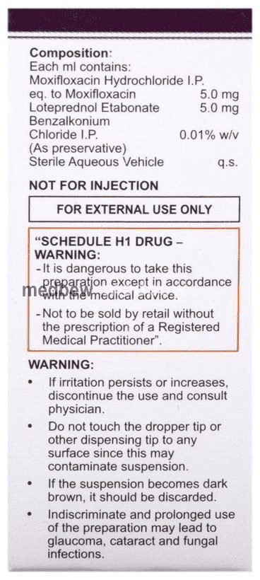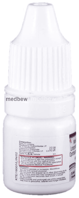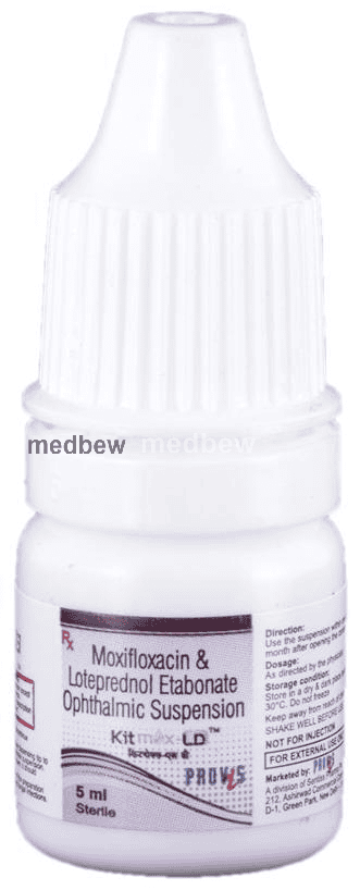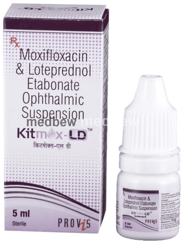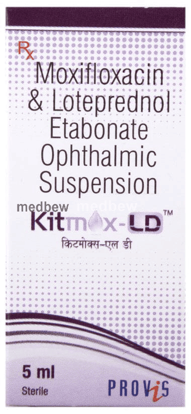 Kitmox-LD Opthalmic Suspension is a combination of two medicines: Loteprednol etabonate and Moxifloxacin. Loteprednol etabonate is a steroid which blocks the production of certain chemical messengers (prostaglandins) that make the eye red, swollen and itchy. Moxifloxacin is an antibiotic which prevents bacterial cells from dividing and repairing, thereby killing the bacteria. This treats your eye infection and inflammation.