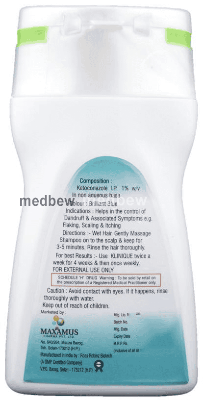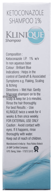 Klinique Shampoo is an antifungal medication used to control scaling, flaking and itching caused by dandruff. Dandruff is caused by excessive growth of Pityrosporum orbiculare (Malassezia furfur), which is part of normal skin flora. It is also used to treat irregular white or brown patches which occur on the body and sometimes appear after being in the sun (tinea/pityriasis versicolor). Regular application of Klinique Shampoo on the scalp relieves itching and discomfort in people suffering from dandruff.