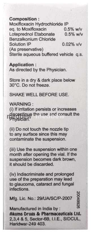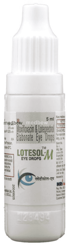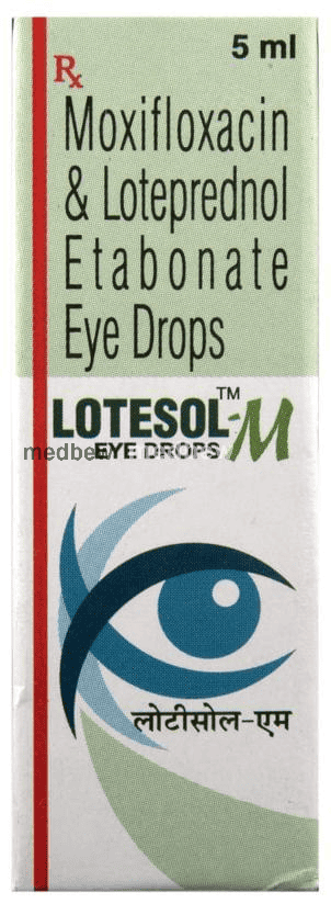 Lotesol-M Eye Drop is a combination of two medicines: Loteprednol etabonate and Moxifloxacin. Loteprednol etabonate is a steroid which blocks the production of certain chemical messengers (prostaglandins) that make the eye red, swollen and itchy. Moxifloxacin is an antibiotic which prevents bacterial cells from dividing and repairing, thereby killing the bacteria. This treats your eye infection and inflammation.