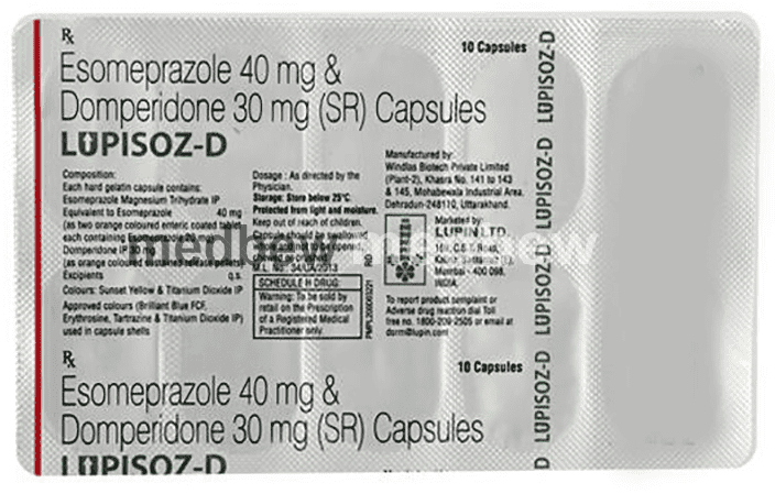 Lupisoz-D Capsule SR is a prescription medicine used to treat gastroesophageal reflux disease (Acid reflux) and indigestion by relieving the symptoms such as heartburn, stomach pain, or irritation. It also neutralizes the acid in the stomach and promotes easy passage of gas to reduce stomach discomfort.