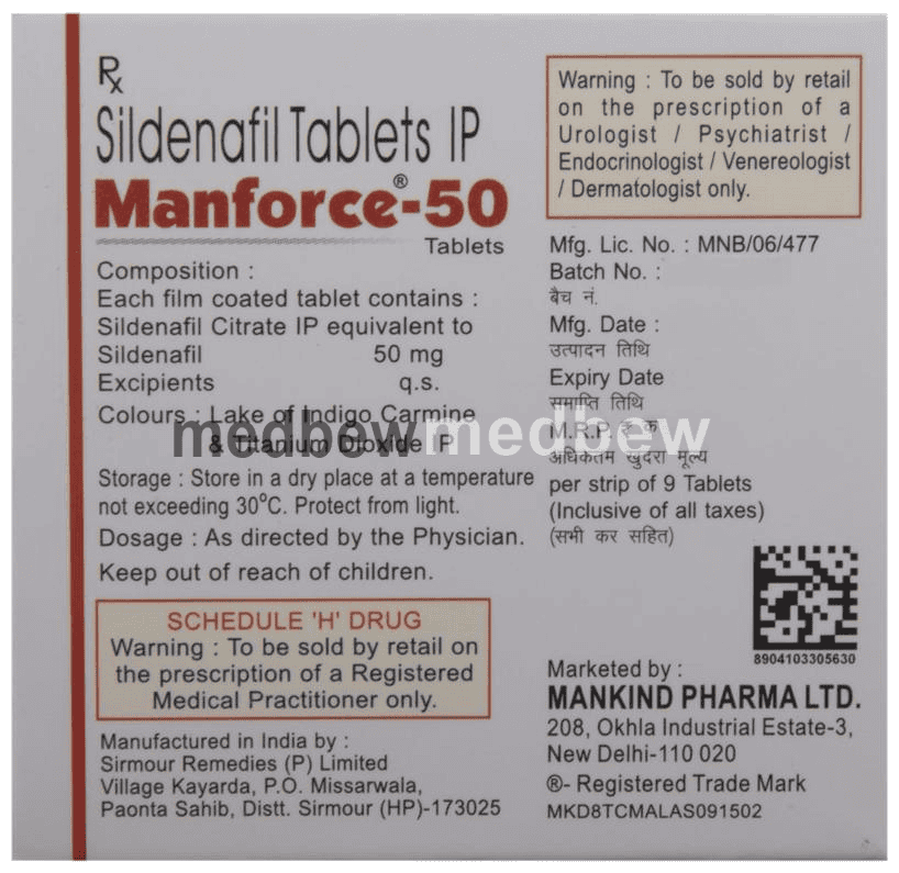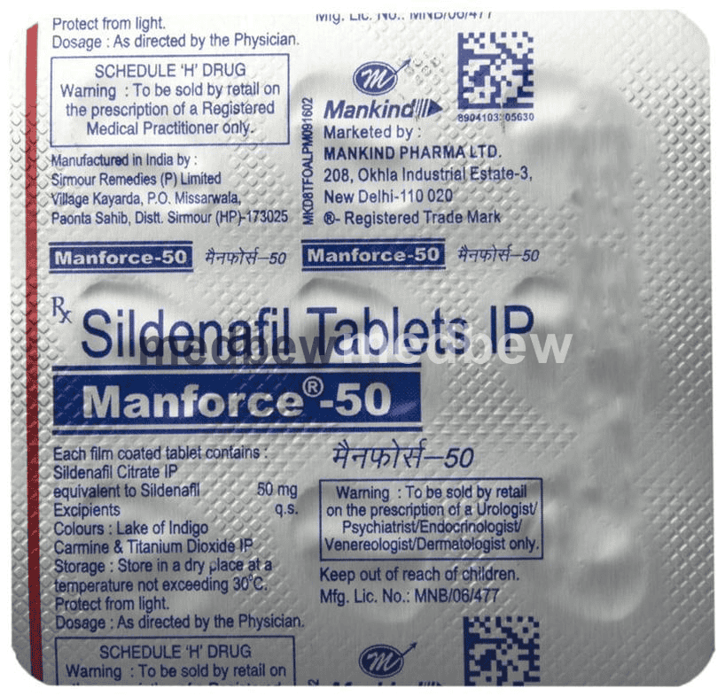 Manforce 50mg Tablet is a prescription medicine used to treat erectile dysfunction (impotence) in men. It works by increasing blood flow to the penis. This helps men to get or maintain an erection. It belongs to a group of medicines known as phosphodiesterase type 5 (PDE 5) inhibitors.