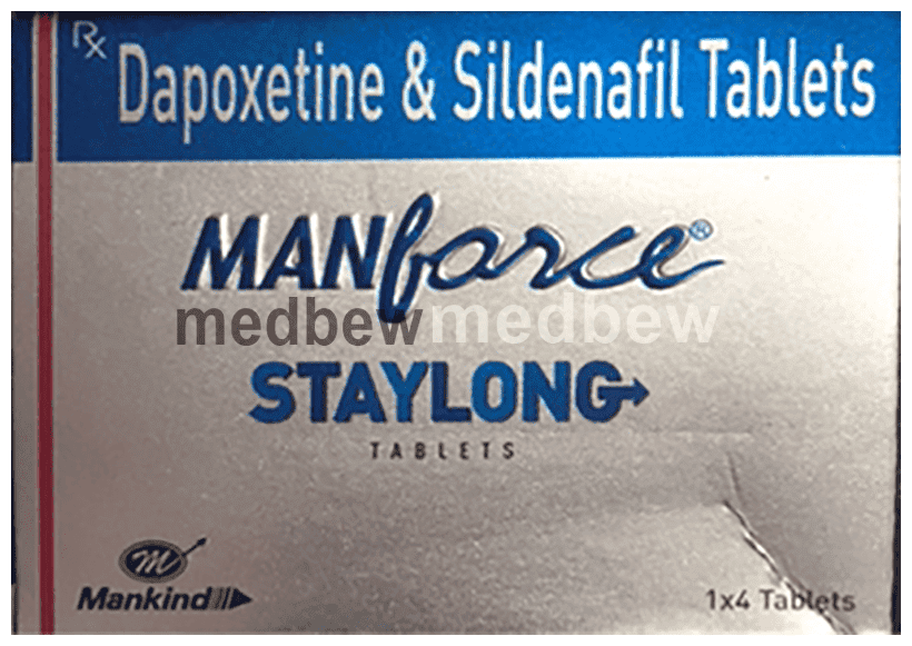 Manforce Staylong Tablet is a combination of two medicines: Sildenafil and Dapoxetine, which treats male erectile dysfunction and premature ejaculation. Sildenafil is a phosphodiesterase type 5 (PDE 5) inhibitor which works by increasing blood flow to the penis during sexual stimulation and enables its erection following sexual stimulation. Dapoxetine is a selective serotonin reuptake inhibitor (SSRI) which increases the level of serotonin in nerves to increase the time taken to ejaculate and improve control over ejaculation.