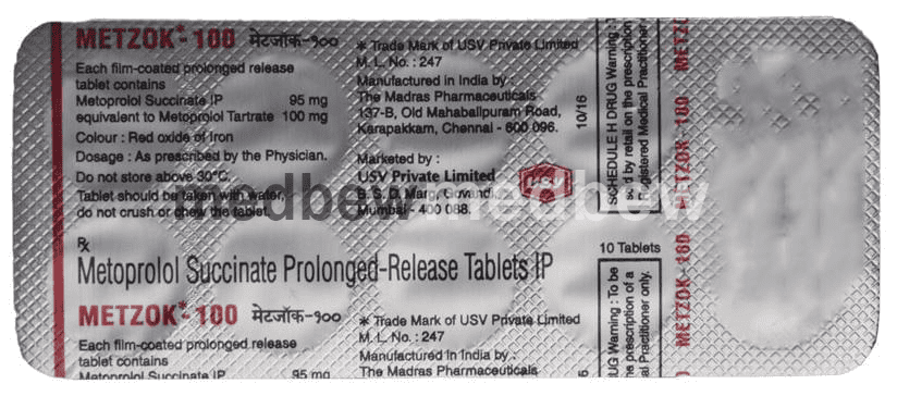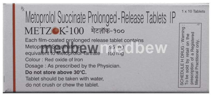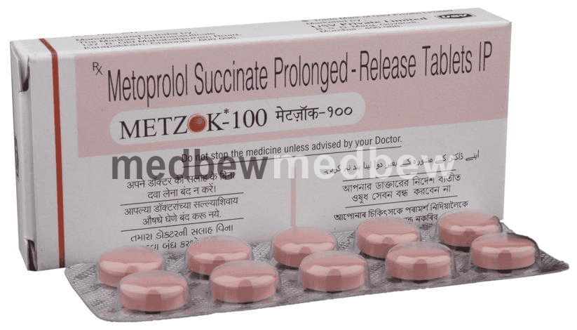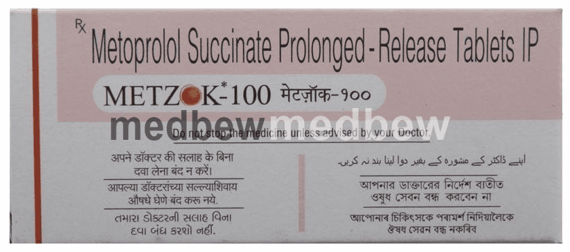Metzok 100 Tablet PR belongs to a group of medicines called beta-blockers. It is used to treat high blood pressure (hypertension), angina (heart-related chest pain), and irregular heart rhythms (arrhythmia). It also helps to prevent migraines, future heart attacks, and stroke.