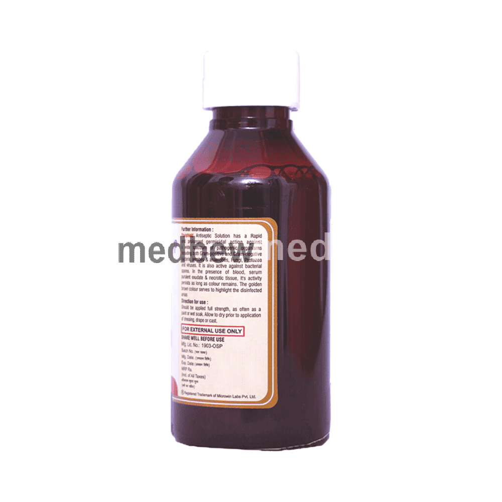 Microwin Povishield 5% Microbicidal Solution Standardised is a versatile antiseptic that is used for the treatment and prevention of infection. Microwin Povishield 5% Microbicidal Solution Standardised kills and prevents the growth of infection-causing microbes, thereby preventing abrasions, cuts, and wounds, or any break in the skin from getting infected. The antiseptic effect is caused due to the slow release of iodine. Keep the affected area clean and use the medicine as prescribed by your doctor.