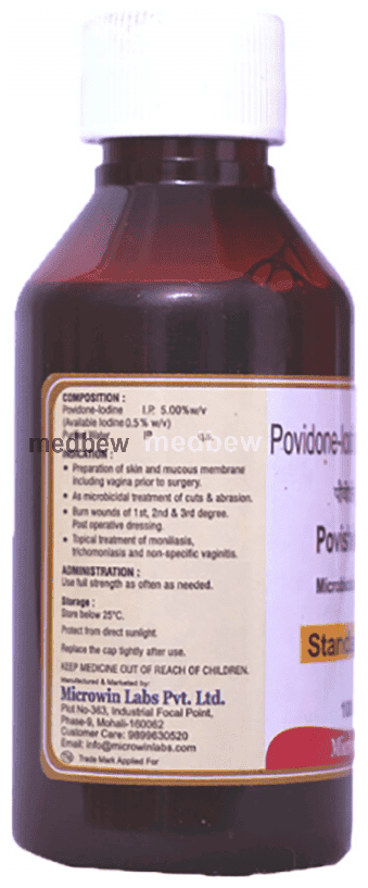 Microwin Povishield 5% Microbicidal Solution Standardised is an antiseptic and disinfectant agent. It is used for prevention of infections in wounds and cuts. It kills the harmful microbes and controls their growth, thereby preventing infections on the affected area.