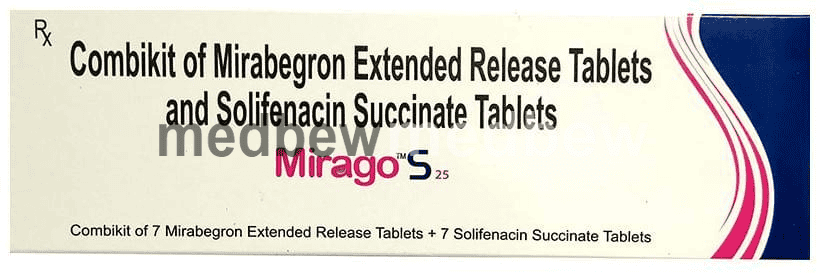 Mirago S 25 Combikit is a combination of two medicines used in the treatment of the symptoms of an overactive bladder. It relieves urinary symptoms like frequent urination, urgent need to urinate and inability to control urination.