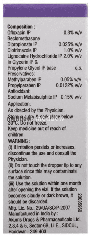This medicine is for external use only. Use it in the dose and duration as advised by your doctor. Check the label for directions before use. Hold the dropper close to the ear without touching it. Gently squeeze the dropper and place the medicine inside ear.