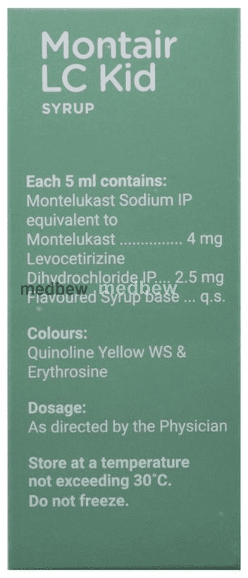 Montair LC Kid Syrup is commonly prescribed in children to treat symptoms of allergy such as runny nose, sneezing, itching, swelling, congestion, and watery eyes. It may also help in the treatment of asthma and skin allergies.