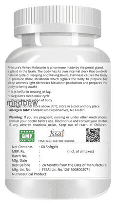 Nature’s Velvet Melatonin 3mg Capsule is a prescription medicine used in the treatment of insomnia and jet lag (a sleep disorder due to frequent travel to different time zones). It reduces jet lag symptoms such as irritability, indigestion, daytime tiredness, and sleep disturbances.