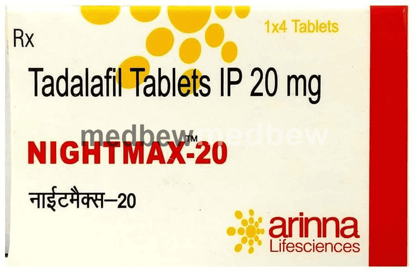 Nightmax 20 Tablet is a phosphodiesterase (PDE-5) inhibitor. It works in erectile dysfunction by increasing blood flow to the penis by relaxing the muscles in penile blood vessels.