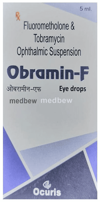 Obramin-F Eye Drop is a combination of two medicines: Tobramycin and Fluorometholone. Tobramycin is an antibiotic. It stops bacterial growth in the eye by preventing the synthesis of essential proteins required by bacteria to carry out vital functions. Fluorometholone is a steroid which blocks the production of certain chemical messengers (prostaglandins) that make the eye red, swollen and itchy.