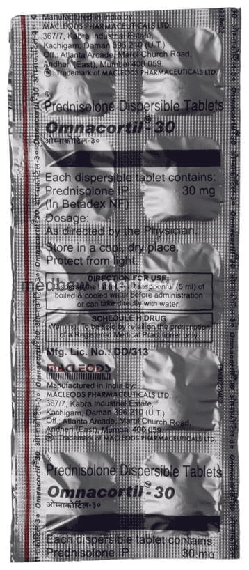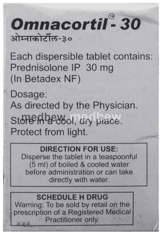 Omnacortil 30 Tablet DT is a corticosteroid. In addition to the many other benefits, it can be used in the treatment of severe allergic reactions. This medicine works by reducing the inflammation associated with allergies. It is a highly effective medicine. Take it in the exact dose and duration as prescribed by your doctor to get most benefit from it.