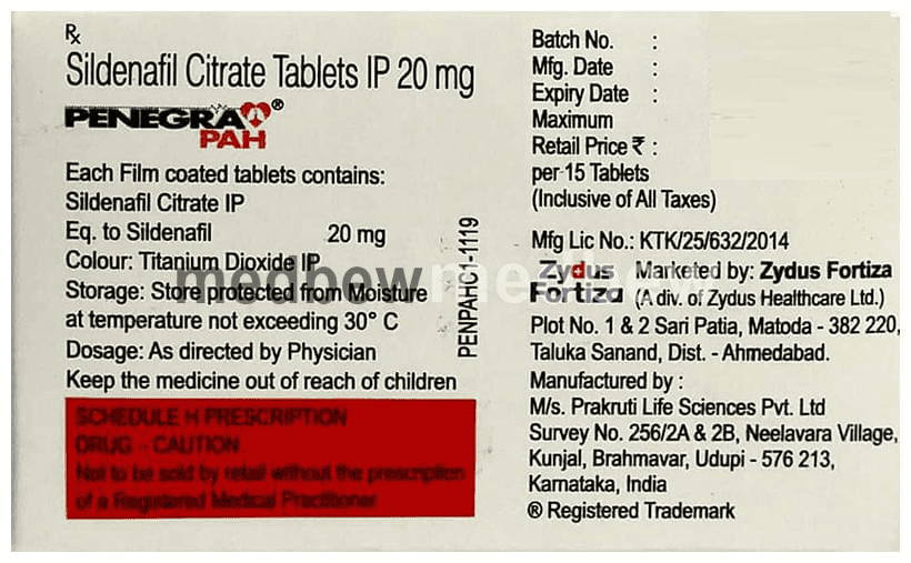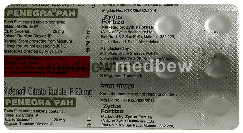 Penegra Pah Tablet is a phosphodiesterase (PDE-5) inhibitor. It works by relaxing the blood vessels in your lungs thereby reducing the high blood pressure in the lungs. This allows your heart to work less to pump blood in your lungs.