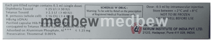 Pentavac PFS Vaccine is a prescription medicine. This combination vaccine is used to prevent Diphtheria, Tetanus, Pertussis, Hepatitis B and Haemophilus Influenzae type b infections. It stimulates the immune system to act against microorganisms to prevent such infections.
