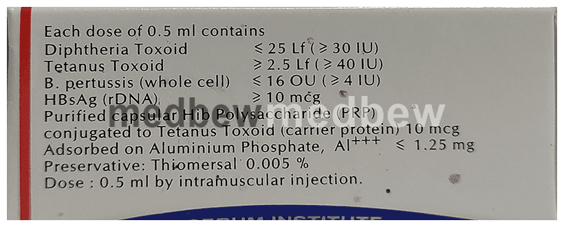 Pentavac SD Vaccine is a prescription medicine. This combination vaccine is used to prevent Diphtheria, Tetanus, Pertussis, Hepatitis B and Haemophilus Influenzae type b infections. It stimulates the immune system to act against microorganisms to prevent such infections.