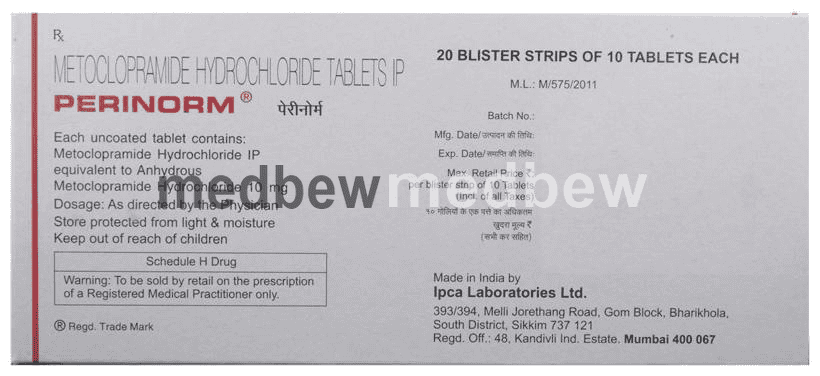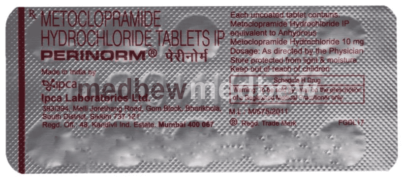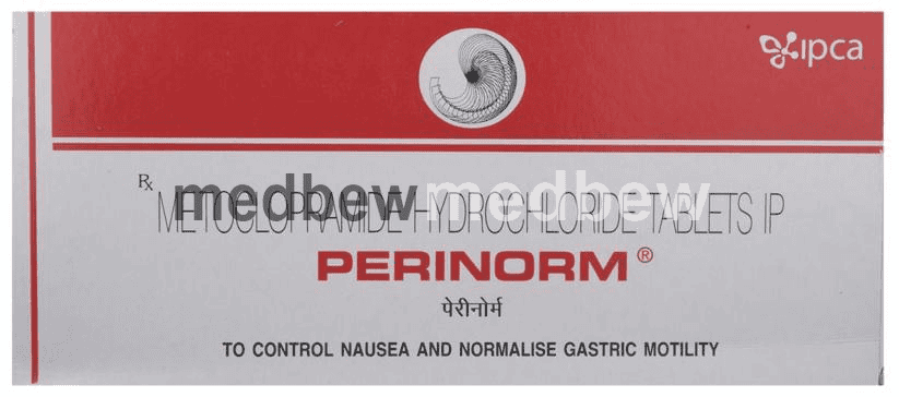 Perinorm Tablet is a prescription medicine used to treat nausea, vomiting, indigestion, and heartburn. It prevents the feeling of fullness during or shortly after a meal and help reduce symptoms caused by the flow of the stomach contents back into the food pipe.