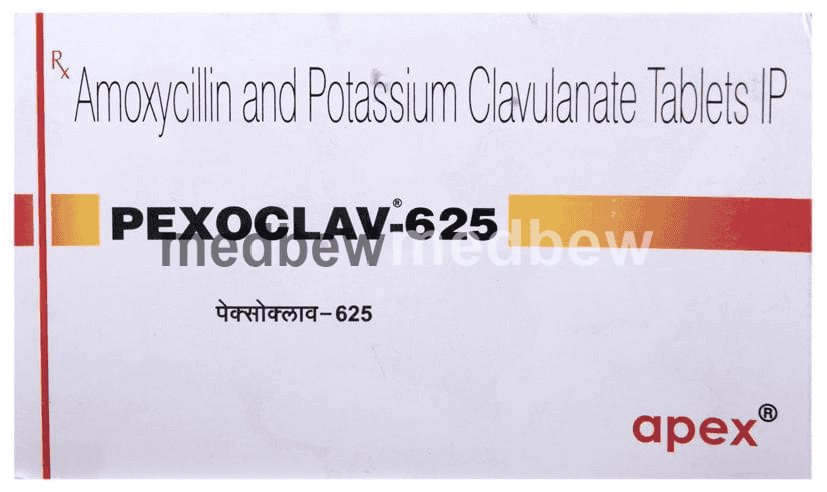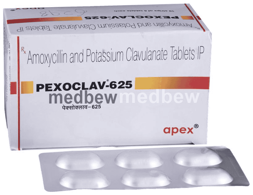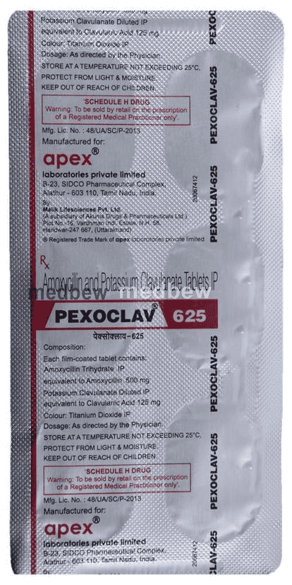 Pexoclav 625 Tablet is a penicillin-type of antibiotic that helps your body fight infections caused by bacteria. It is used to treat infections of the lungs (e.g., pneumonia), ear, nasal sinus, urinary tract, skin and soft tissue. It will not work for viral infections such as the common cold.