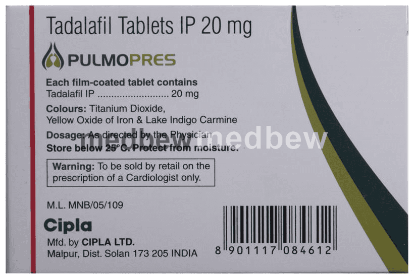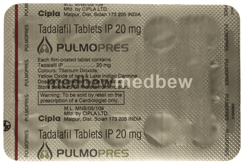 Pulmopres Tablet is a phosphodiesterase (PDE-5) inhibitor. It works in pulmonary hypertension by relaxing the blood vessels in the lungs to allow blood to flow more easily.