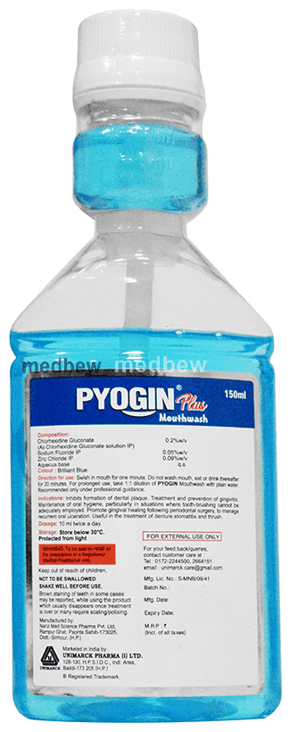 Pyogin Plus Mouth Wash is a combination of three medicines. It is used to treat infection of mouth or gums. This mouthwash has antimicrobial action on the infection-causing bacteria. It also prevents the teeth from getting cavities and makes them stronger.