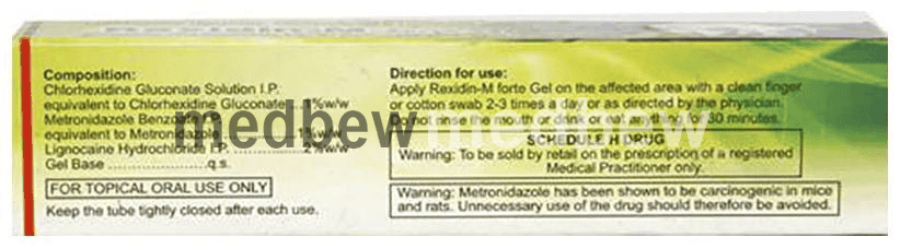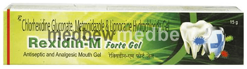Rexidin-M Forte Gel is a combination of three medicines: Lidocaine, Chlorhexidine Gluconate and Metronidazole, which treats mouth sores. Lidocaine is a local anesthetic which forms a protective coating over the mouth sores and blocks pain signals to further relieve pain. Chlorhexidine Gluconate is an antiseptic and disinfectant which effectively cleans out the ulcer surface to prevent infection. Metronidazole is an antibiotic which kills the bacteria and other microorganisms by damaging their DNA.