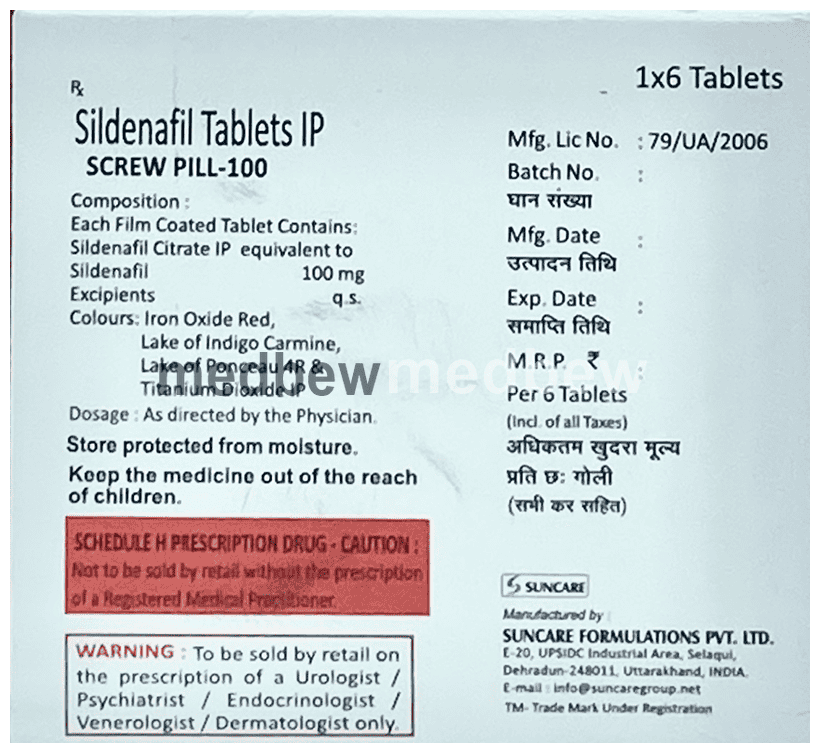 Screw Pill 100 Tablet belongs to a group of medicines known as phosphodiesterase type 5 (PDE 5) inhibitors. It may be taken on an empty stomach or with a meal, but it should be taken at a fixed time each day. The dose and how often you need to take it will be decided by your doctor so that you get the right amount to control your symptoms. Follow the advice of your doctor. It is important to take this medicine regularly and for as long as you are advised, even if you feel well. Missing doses may lead to the worsening of your condition.