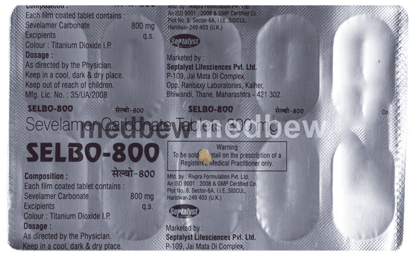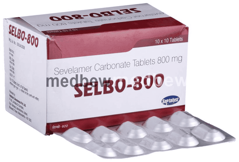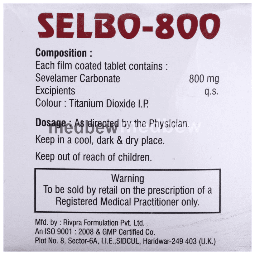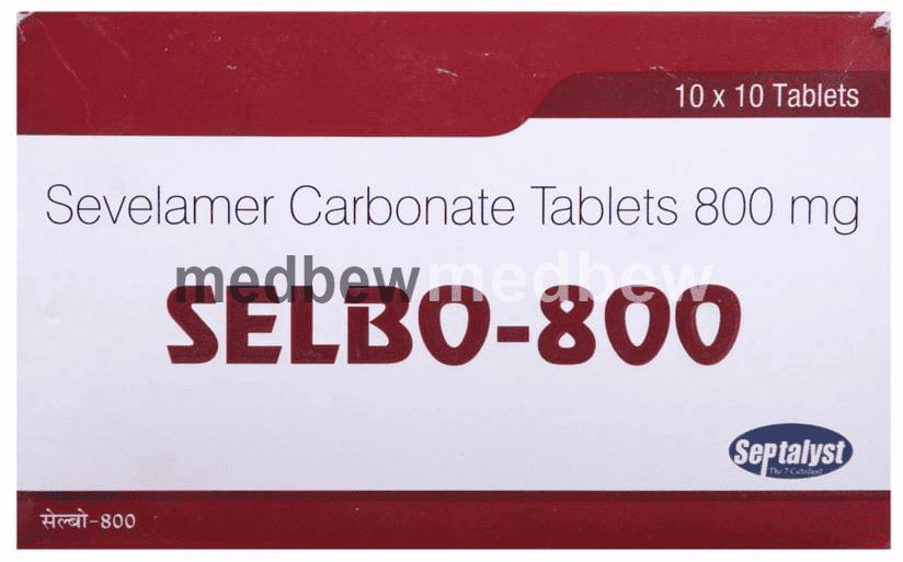 Selbo 800 Tablet is used to treat increased phosphate levels in the blood. It is used in patients who are on dialysis due to severe kidney disease. It inhibits the absorption of phosphate from the intestine and lowers the phosphate levels in the blood.