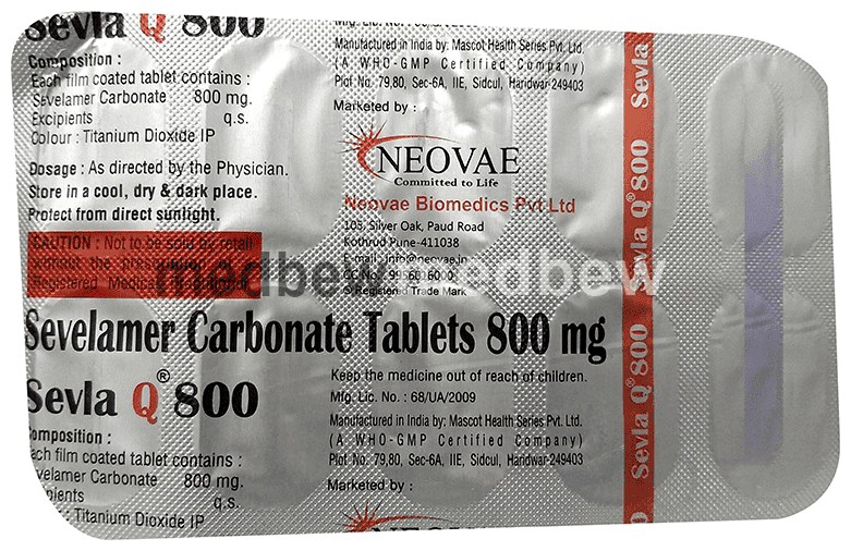 Sevla Q 800 Tablet is used to treat increased phosphate levels in the blood. It is used in patients who are on dialysis due to severe kidney disease. It inhibits the absorption of phosphate from the intestine and lowers the phosphate levels in the blood.