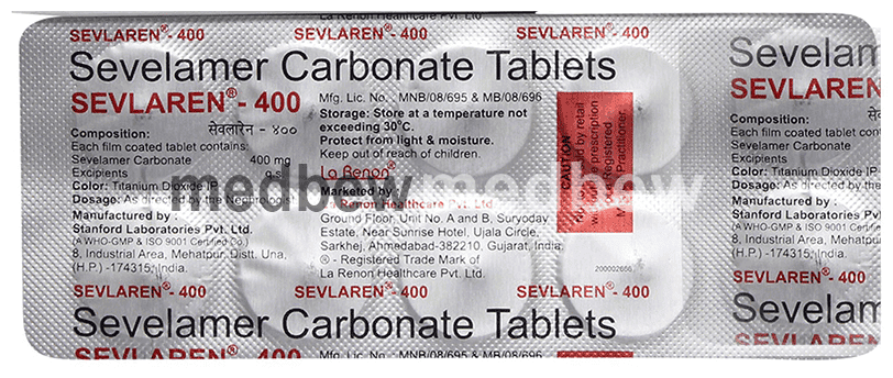 Sevlaren 400 Tablet is used to treat increased phosphate levels in the blood. It is used in patients who are on dialysis due to severe kidney disease. It inhibits the absorption of phosphate from the intestine and lowers the phosphate levels in the blood.