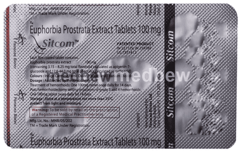 Sitcom Tablet is herbal medicine. It is used in the treatment of piles/hemorrhoids. It works by shrinking the blood vessels and relieves symptoms such as bleeding, itching, discomfort, and pain.
