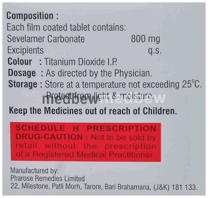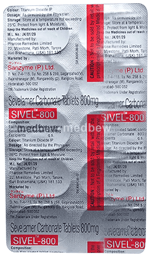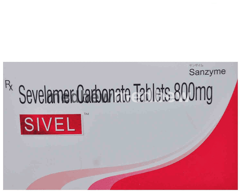 Sivel 800 Tablet is used to treat increased phosphate levels in the blood. It is used in patients who are on dialysis due to severe kidney disease. It inhibits the absorption of phosphate from the intestine and lowers the phosphate levels in the blood.