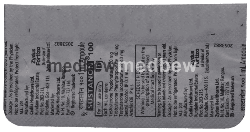 Sustanon 100 Injection is similar to the natural male hormone, testosterone. It works by replenishing the deficient testosterone levels in adult men. Lack of testosterone may cause various health problems including impotence, infertility, low sex drive, tiredness, depressive mood and bone loss.