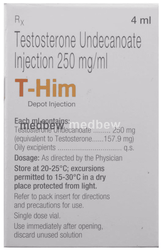 Male hypogonadism is a condition in which the body does not produce enough testosterone (male sex hormone). T-Him Depot Injection injections help improve the level of testosterone in your body. This helps in maintaining better sex life, improve overall physical appearance, gives good mood and boost overall confidence. T-Him Depot Injection also helps in muscle building and development of bones. This treatment has few side effects so it is advisable to always take the injection under a doctor’s supervision only. You should continue taking it as long as it is prescribed even if you feel better.