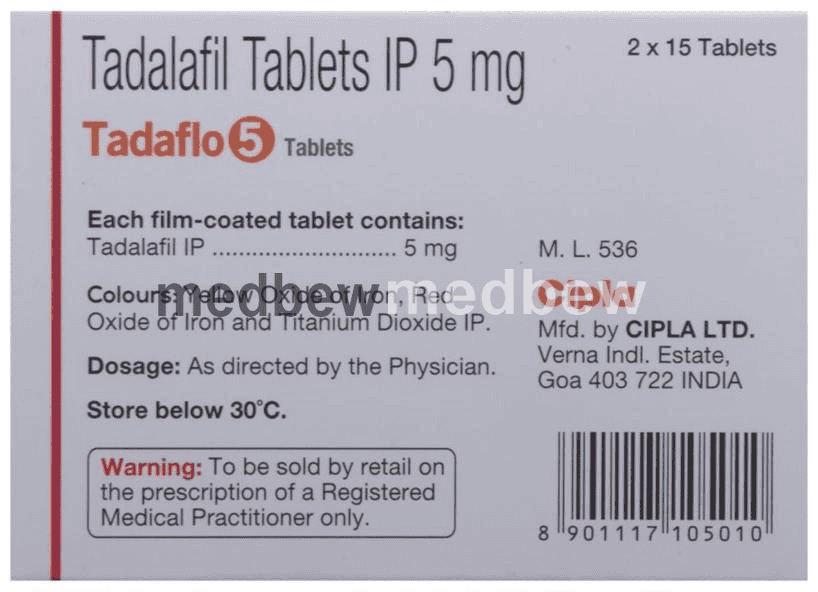 Tadaflo 5 Tablet is a phosphodiesterase (PDE-5) inhibitor. It works in erectile dysfunction by increasing blood flow to penis by relaxing the muscles in penile blood vessels.
