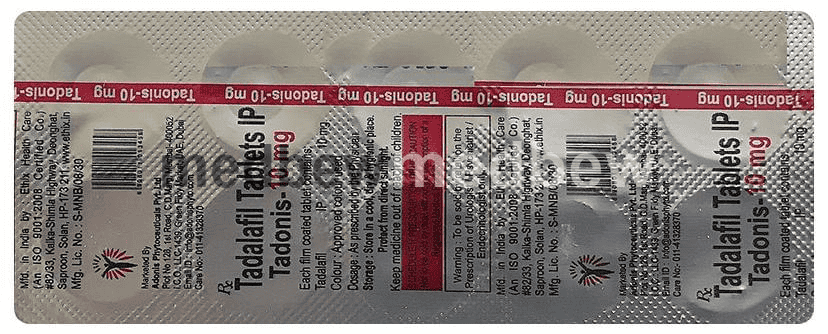 Tadonis 10mg Tablet is a phosphodiesterase (PDE-5) inhibitor. It works in erectile dysfunction by increasing blood flow to the penis by relaxing the muscles in penile blood vessels.