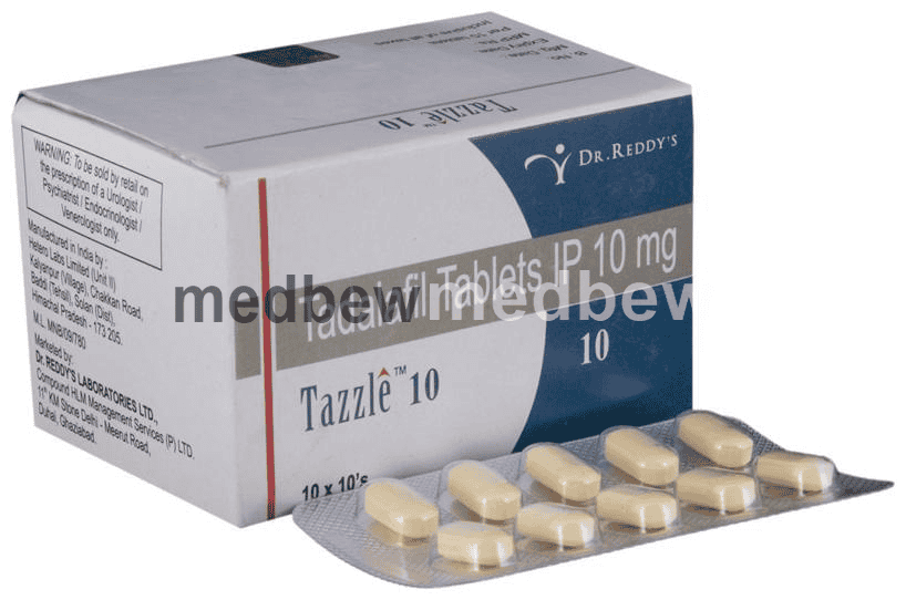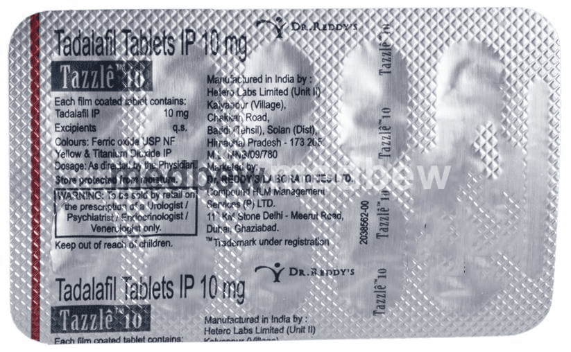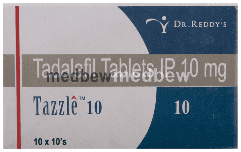 Tazzle 10 Tablet is a phosphodiesterase (PDE-5) inhibitor. It works in erectile dysfunction by increasing blood flow to the penis by relaxing the muscles in penile blood vessels.